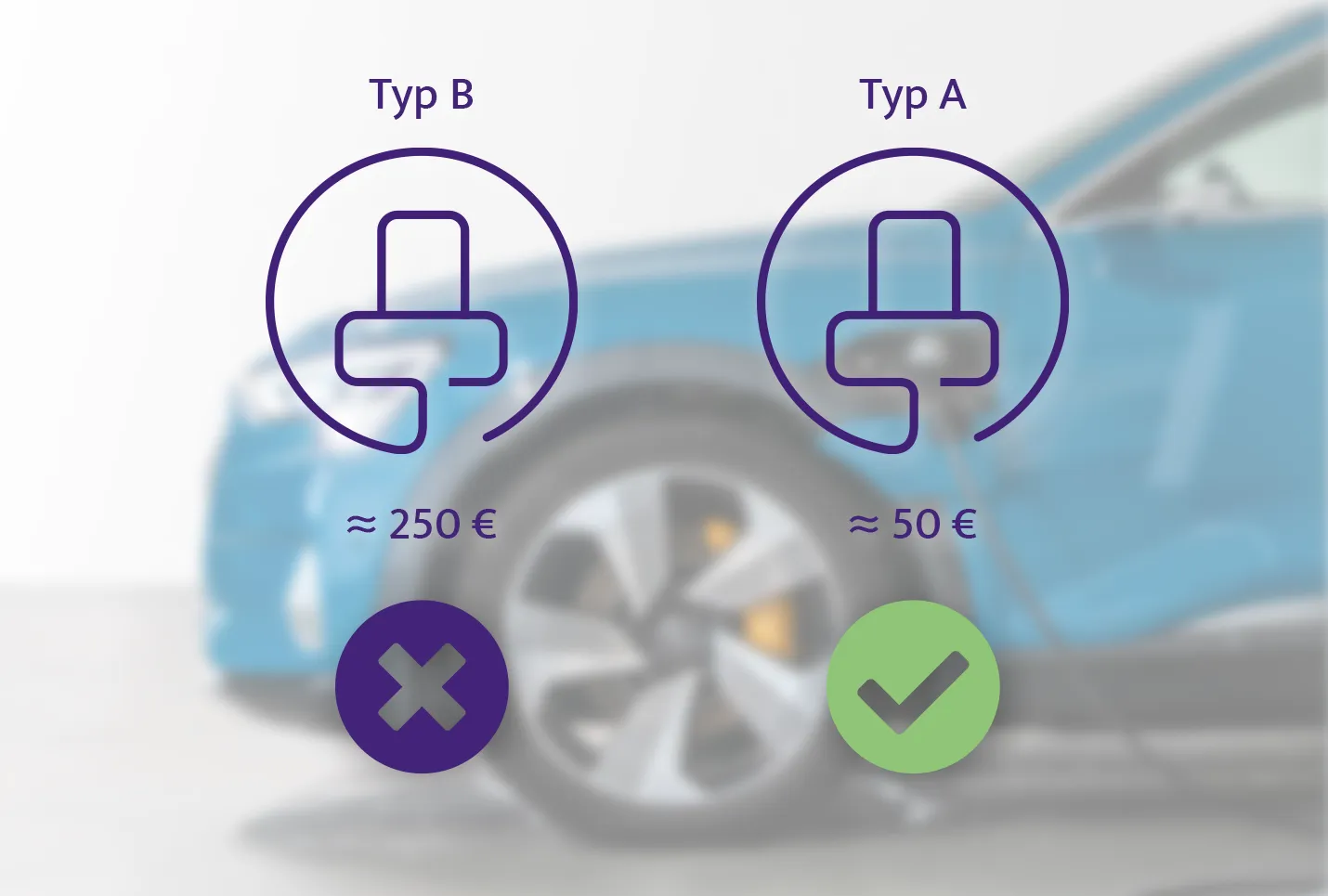 Jetzt wird es sehr technisch, aber auch wichtig! Die TECHNIVOLT 2200 SMART PRO besitzt bereits eine integrierte elektronische Erkennung von glatten Gleichfehlerströmen im Bereich von IΔn ≥ 6 mA, wie sie die DIN EN 61851-1 für Elektrofahrzeuge vorschreibt. Sie stellt sicher, dass die Stromversorgung des Fahrzeugs im Falle eines Fehlergleichstroms größer 6 mA getrennt wird. Das bedeutet für den Elektriker, der die Wallbox anschließt: Er benötigt lediglich einen Fehlerstromschutzschalter vom Typ A, der deutlich günstiger als ein Schalter vom Typ B ist.