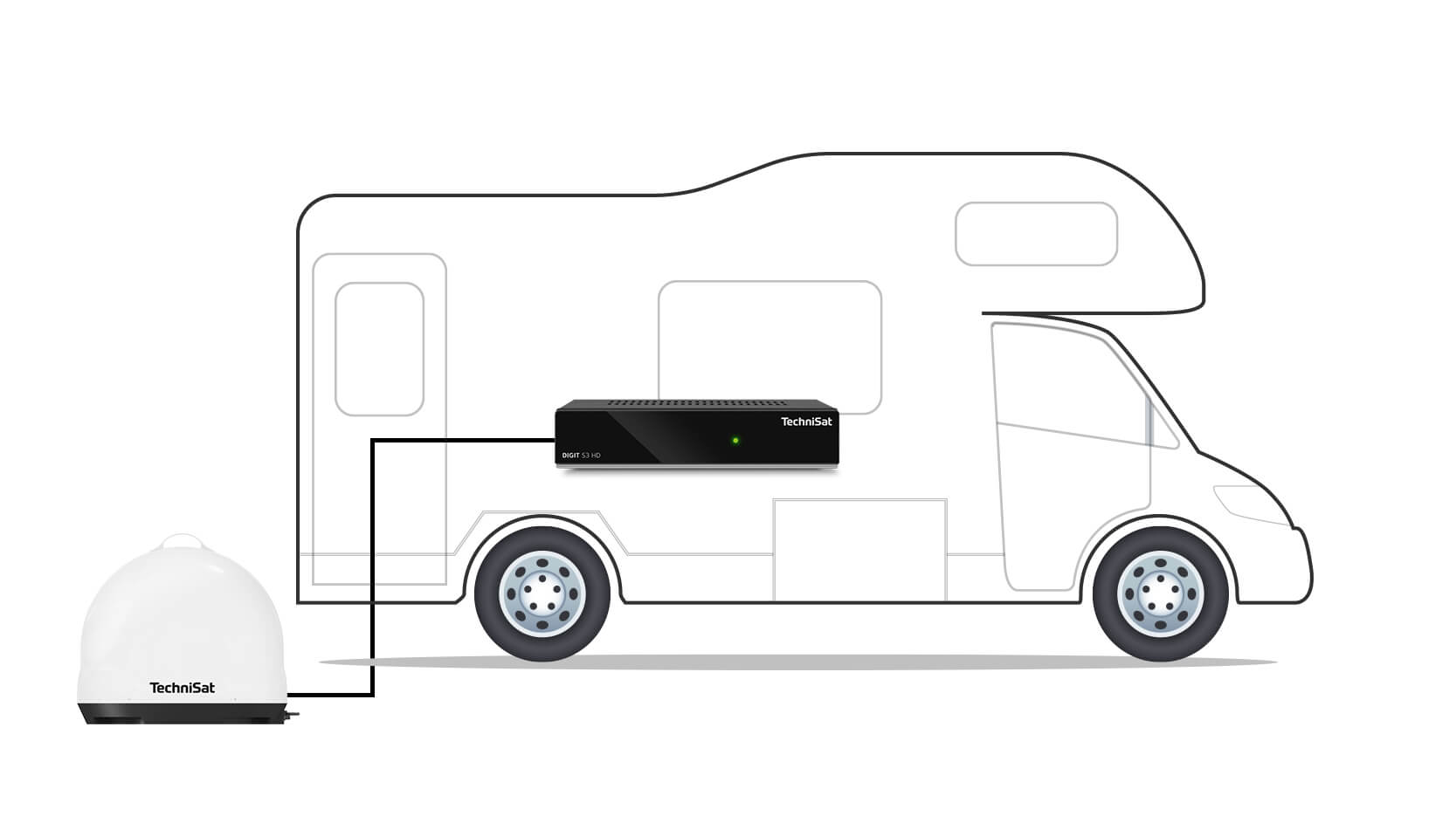 Die SKYRIDER DOME ISI mit Single-LNB versorgt einen Receiver oder Fernseher im Wohnwagen mit Sat-Signalen der Orbitposition Astra 19,2° Ost. Der Strom für die Kuppelantenne kommt dabei direkt vom angeschlossenen Empfangsgerät über das Satkabel. Eine zusätzliche Stromversorgung wird nicht benötigt.