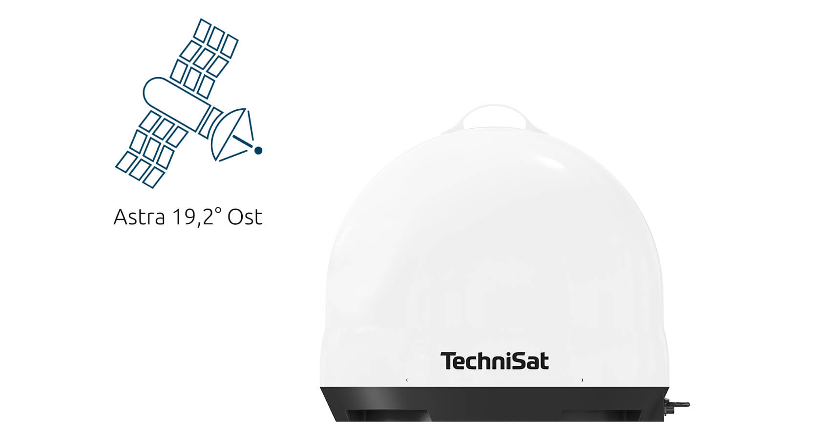 - Fix ausgerichtet: Dank des elektronischen Motors richtet sich die Antenne automatisch aus. In maximal 3 Minuten findet sie den Satelliten Astra 19,2° mit den gängigen deutschsprachigen Programmen