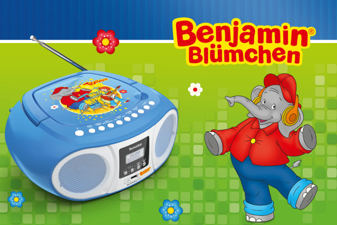In der Benjamin Blümchen Edition bringt das DIGITRADIO 1990 kleinen Benjamin-Fans noch mehr Freude beim Eintauchen in die Geschichten und Abenteuer. Denn die Oberseite, genauer das CD-Fach, begeistert mit einer großen Grafik, die Benjamin und Otto beim Musizieren zeigt. So sind die Lieblingsfiguren immer Blick.